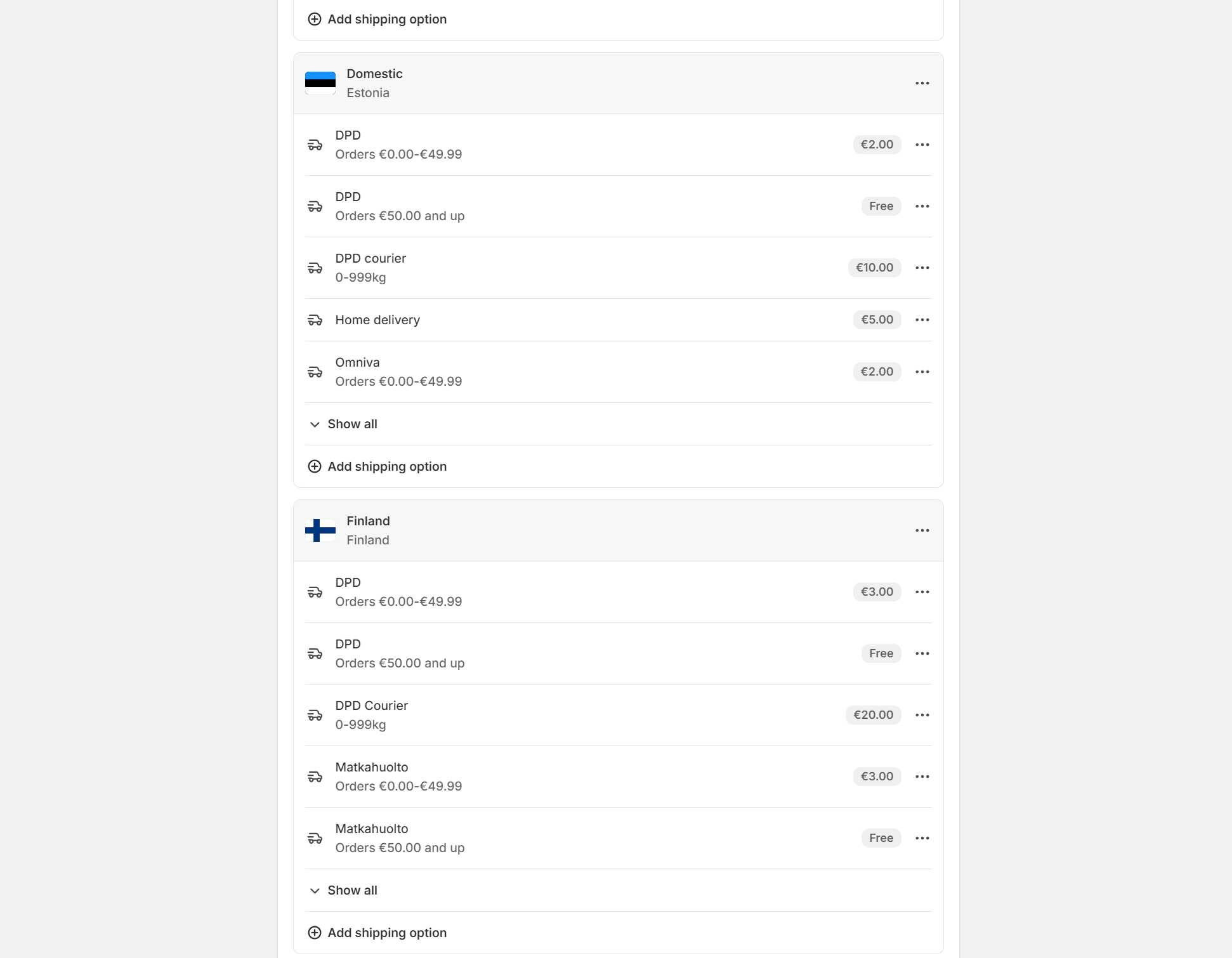 * If you don't see any selections under Delivery settings. For example, SmartPosti Latvia selection is empty, which means that you haven't added a shipping rate for Latvia yet. You would need to return to the store shipping profile and add a shipping rate.