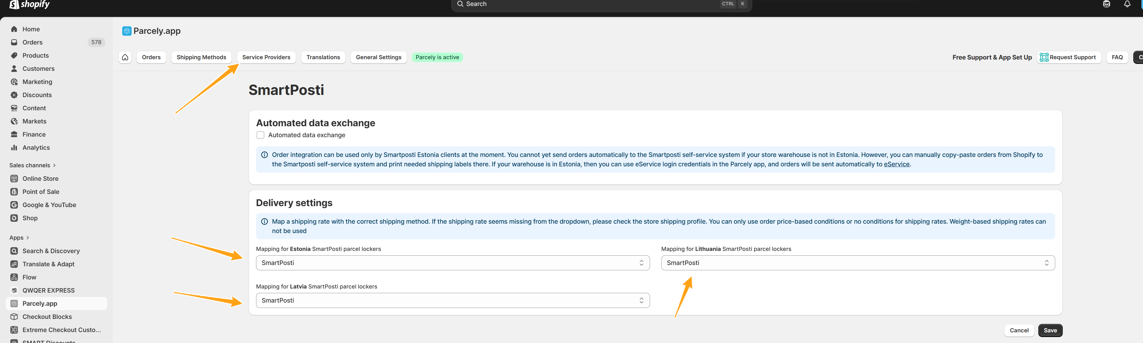 - Connect the Shopify shipping rate with the Parcely shipping method under Parcely Service Providers tab, like this