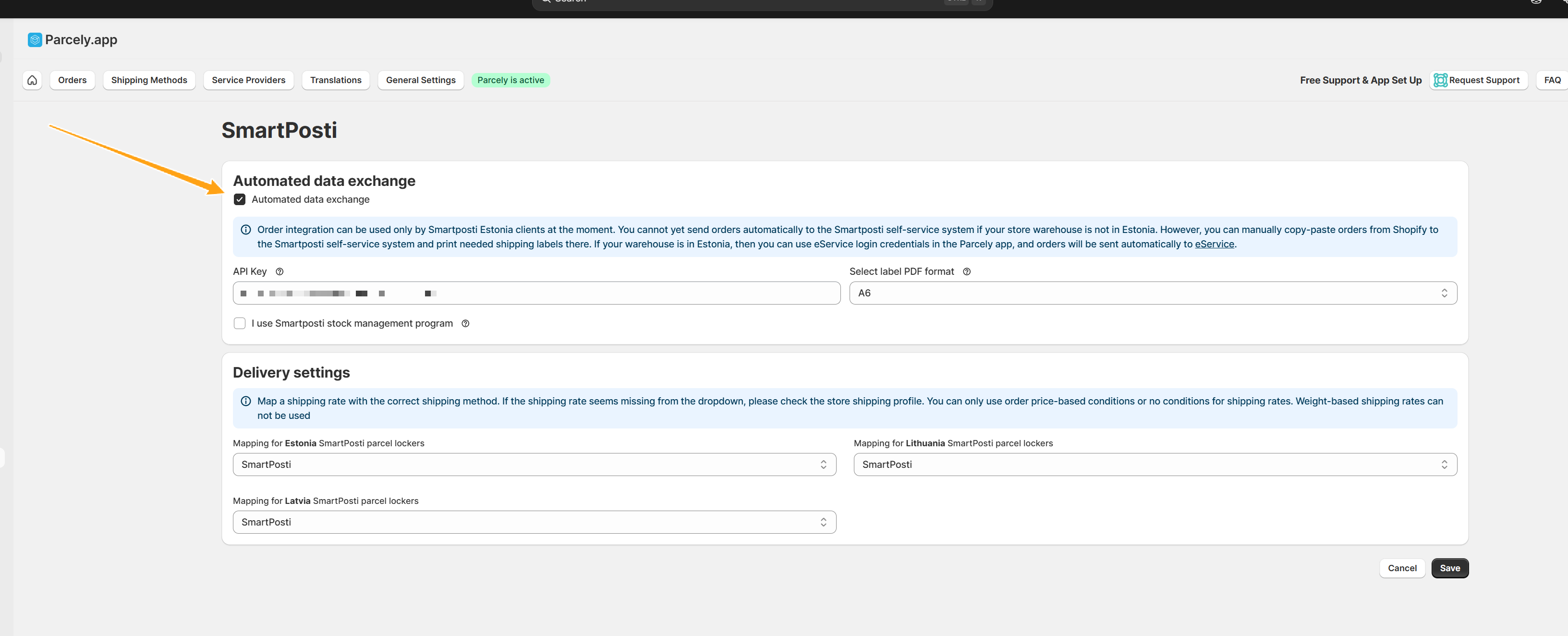 * If the shipping method is grayed out, it means the shipping method is not activated yet. Check the shipping method under the shipping methods tab. - Activate the shipping service provider API, by selecting "Automated data exchange" and filling in all API setting fields. (You can skip this step if you are not planning to export orders to the service provider system or if you are using Montonio Shipping)