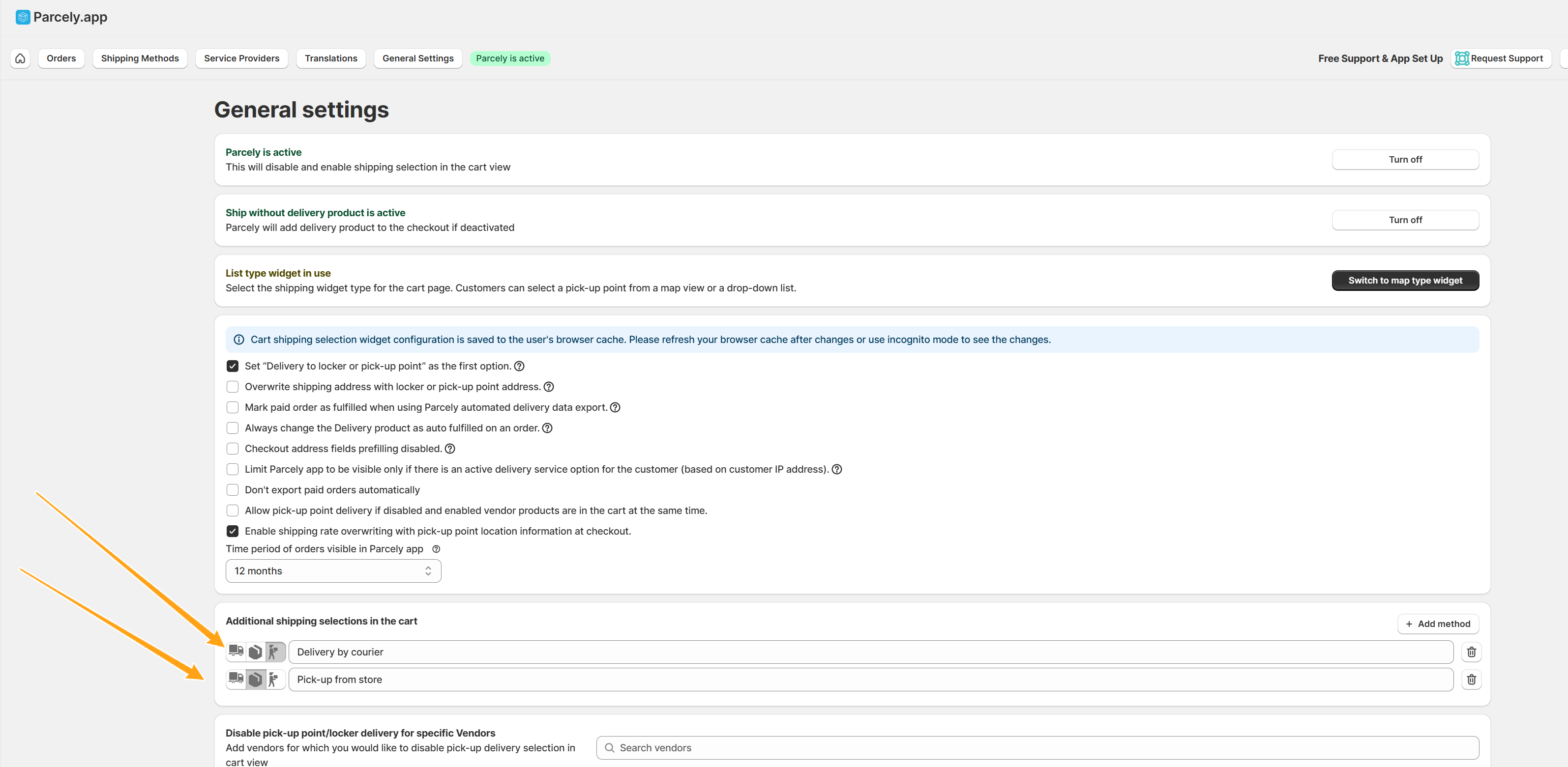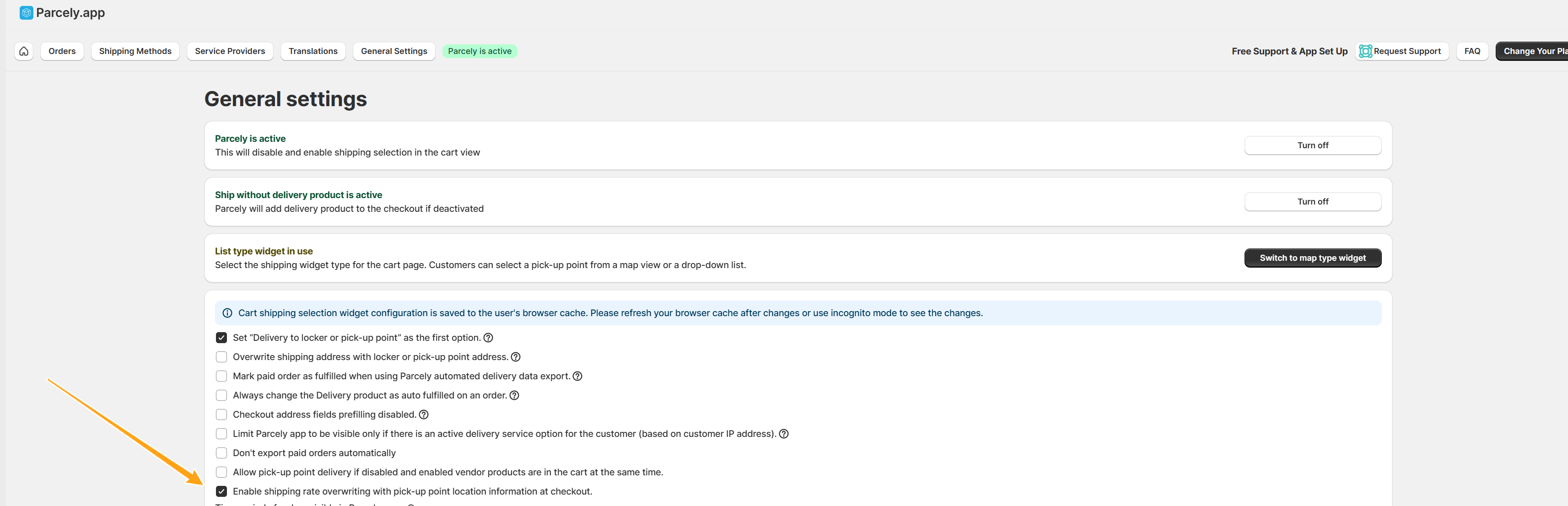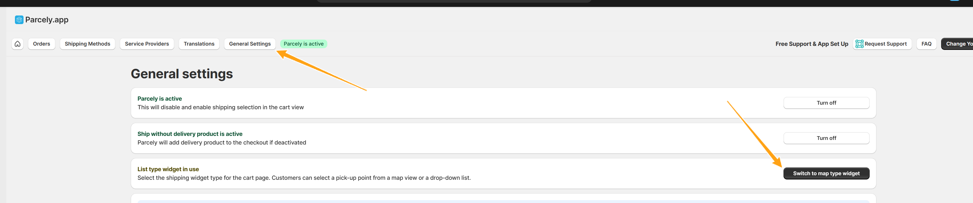 - Choose if you want to use the List or Map pick-up point selection widget in the Cart page under the app General Settings tab