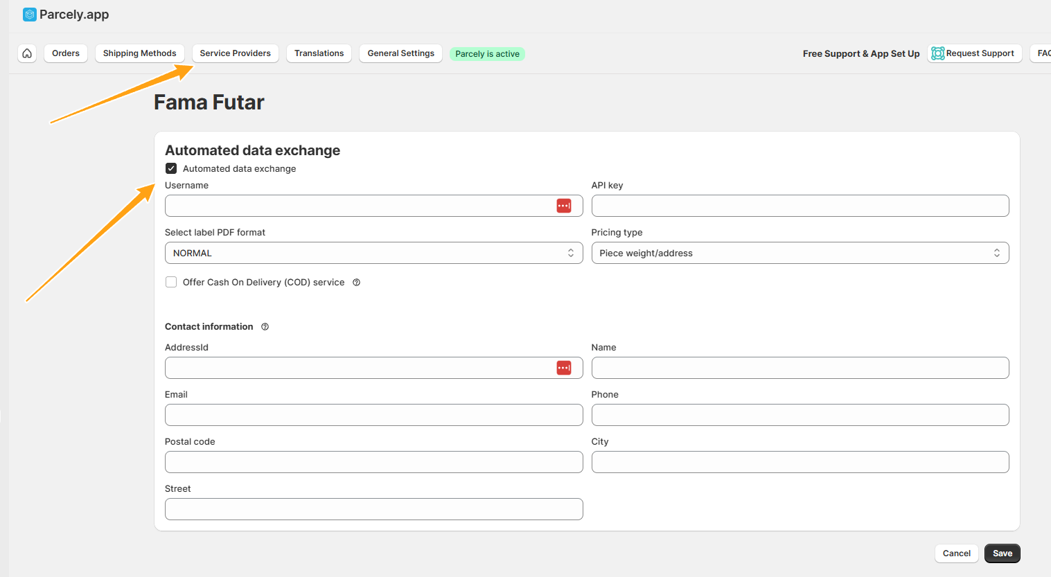 To activate Fama Futra order exporting, please open the Parcely app in your store and move to "Service Providers"→select "Fama Futra "→check "Automated data exchange".